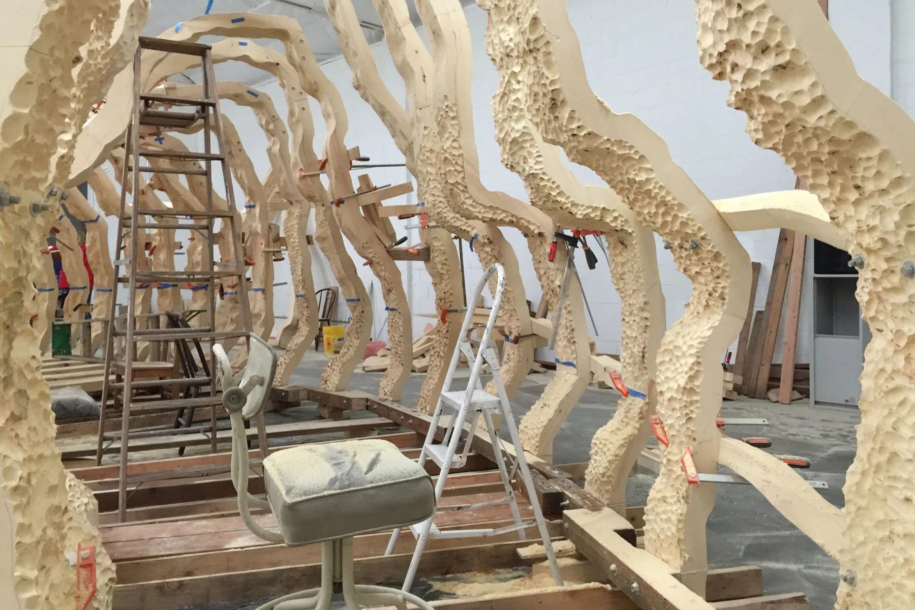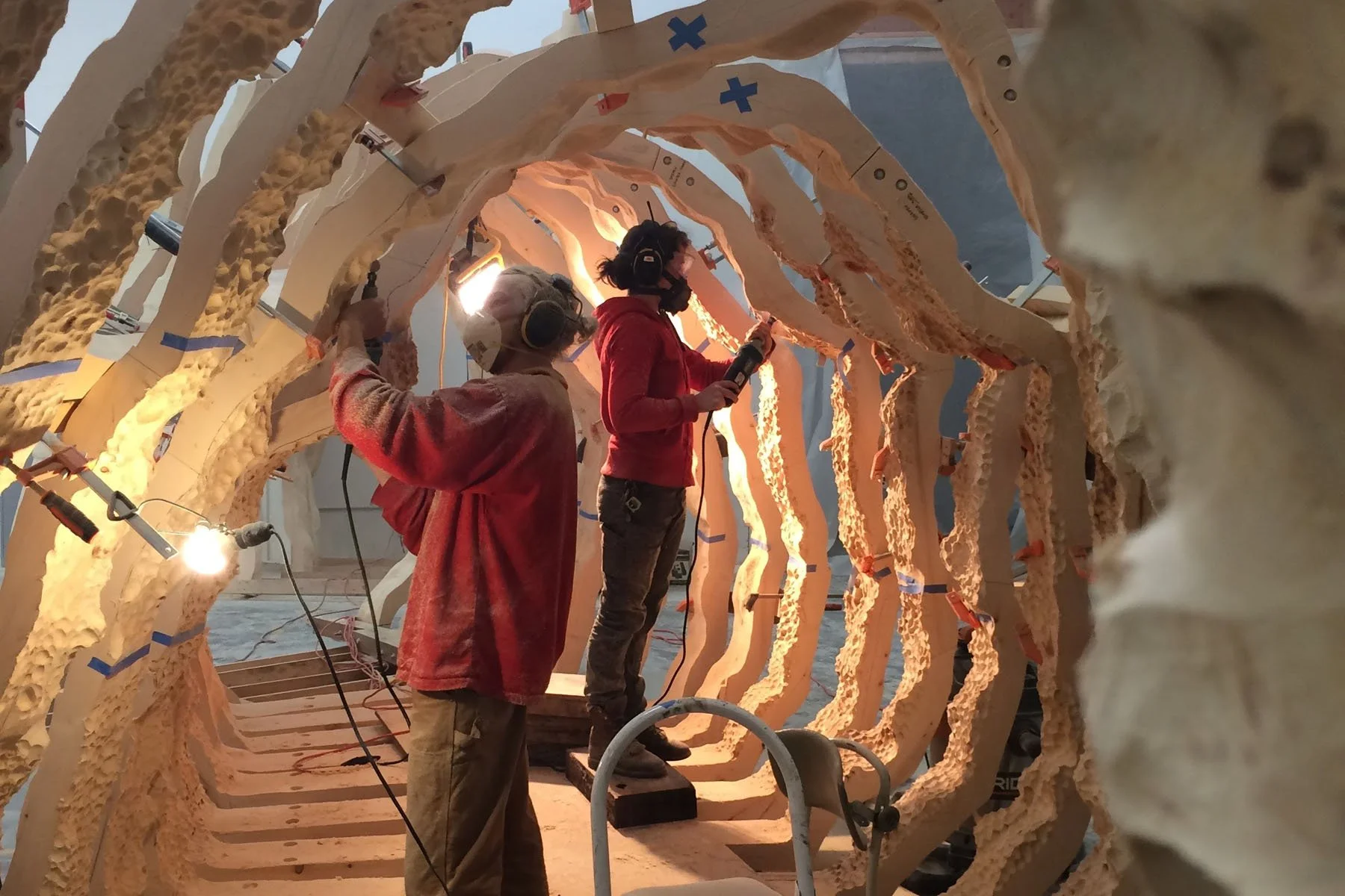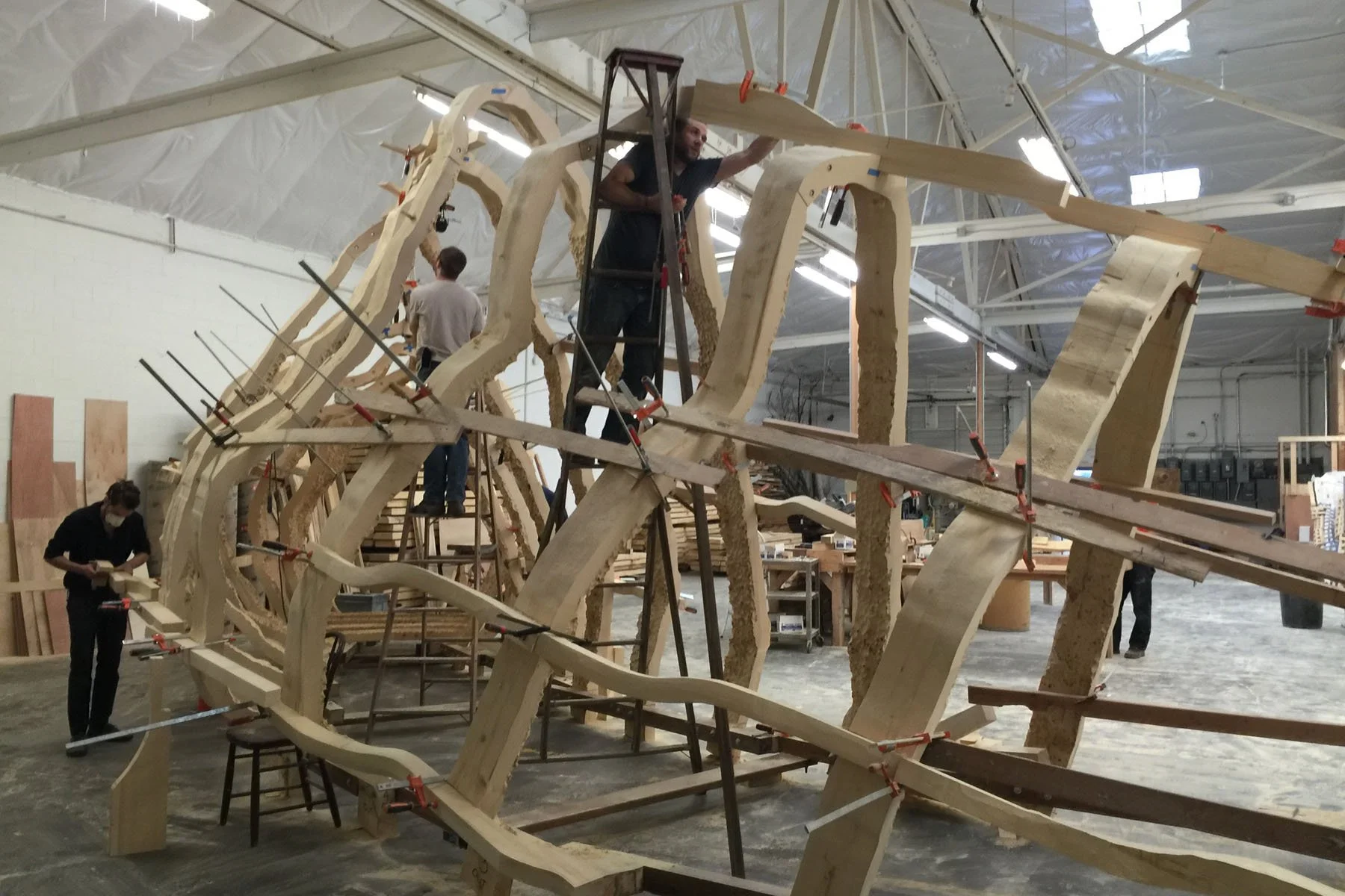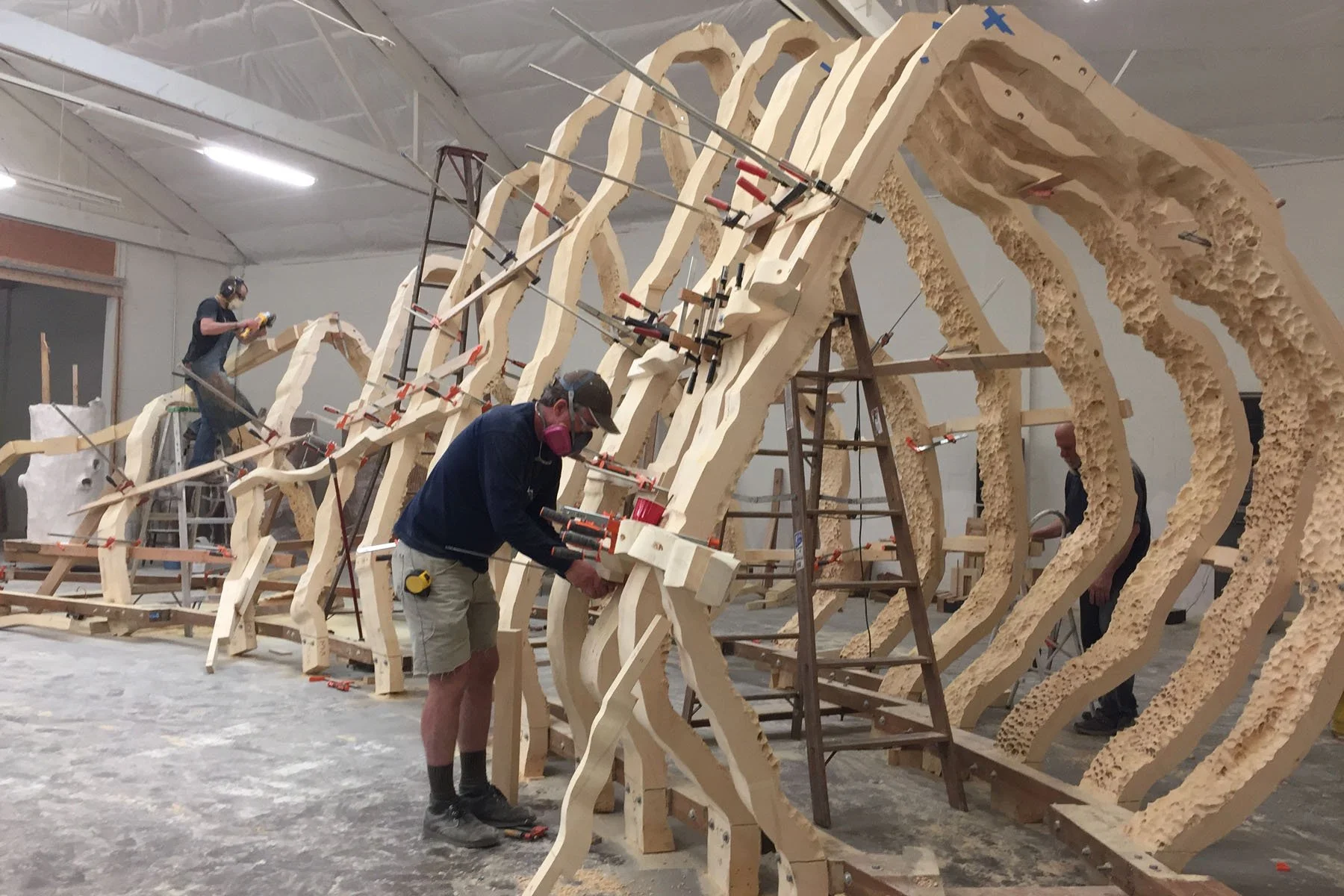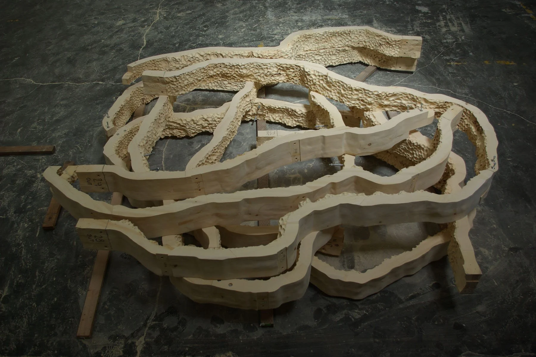 Spur was designed to be installed at multiple locations with an understructure buried one foot below grade. The wood ribs were made with three layers of wood and the twisting horizontal rail-like pairs on each side were made with two to four layers depending upon the complexity of the area.
