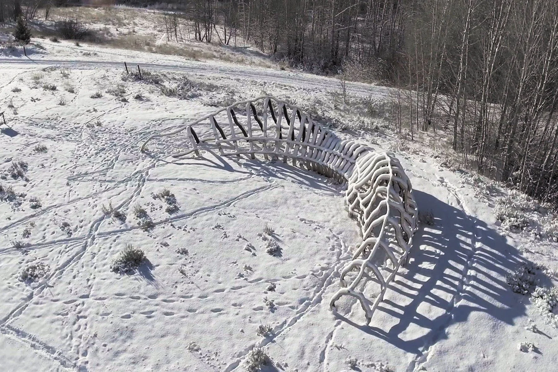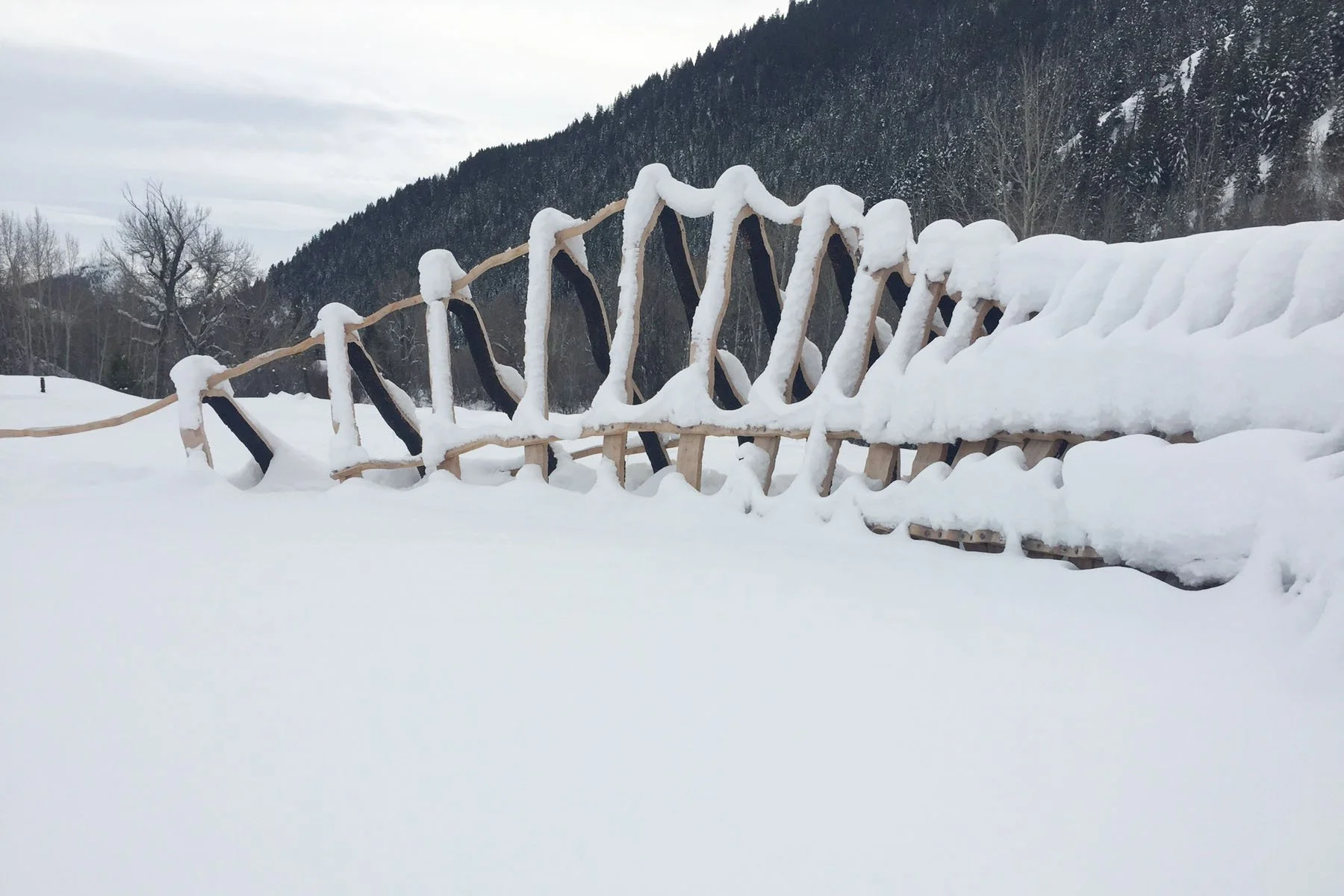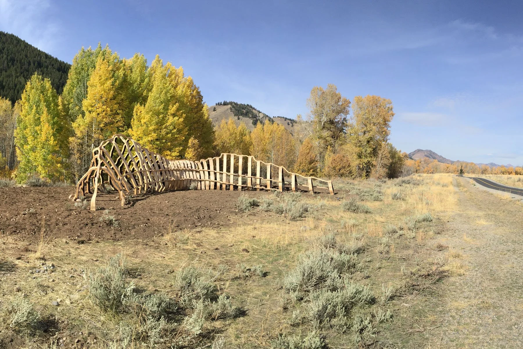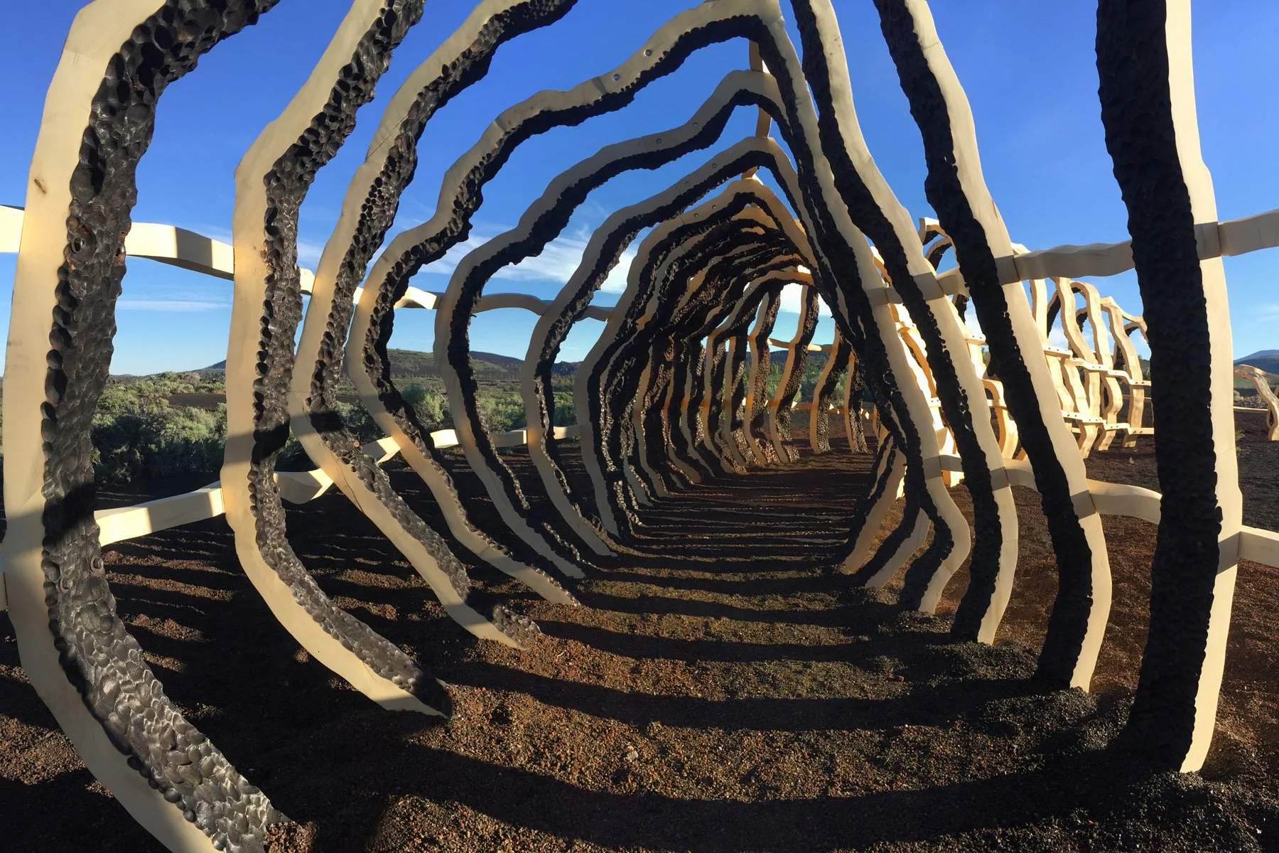 Spur was inspired by lava tube caves under the surface of Craters of the Moon National Monument in Central Idaho, where it was temporarily installed. The sculpture was also inspired by the history of the Intermountain West Railroad, particularly the spur line that once diverged north from the main tracks, abutting the National Monument into the Wood River Valley. Struck by its extraordinary geology, Grade digitally scanned the interior of a lava tube cave as the basis for the sculpture. Large enough for visitors to pass through, the sculpture is constructed of standing dead yellow cedar salvaged from Mitkof Island, Alaska. With its charred black interior surfaces, the journey through Grade’s sculpture alludes to the experience of exploring caves within the park. The sculpture’s vertical members are scaled to the thickness of railroad ties and the paired horizontal spines running the length of the sculpture evoke railroad tracks as well as mirroring the surrounding horizon lines of undulating mountain peaks. In October 2016, the sculpture was relocated and permanently installed in the Wood River Valley in Ketchum, Idaho.