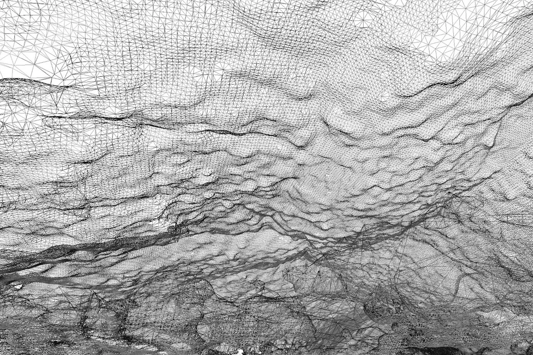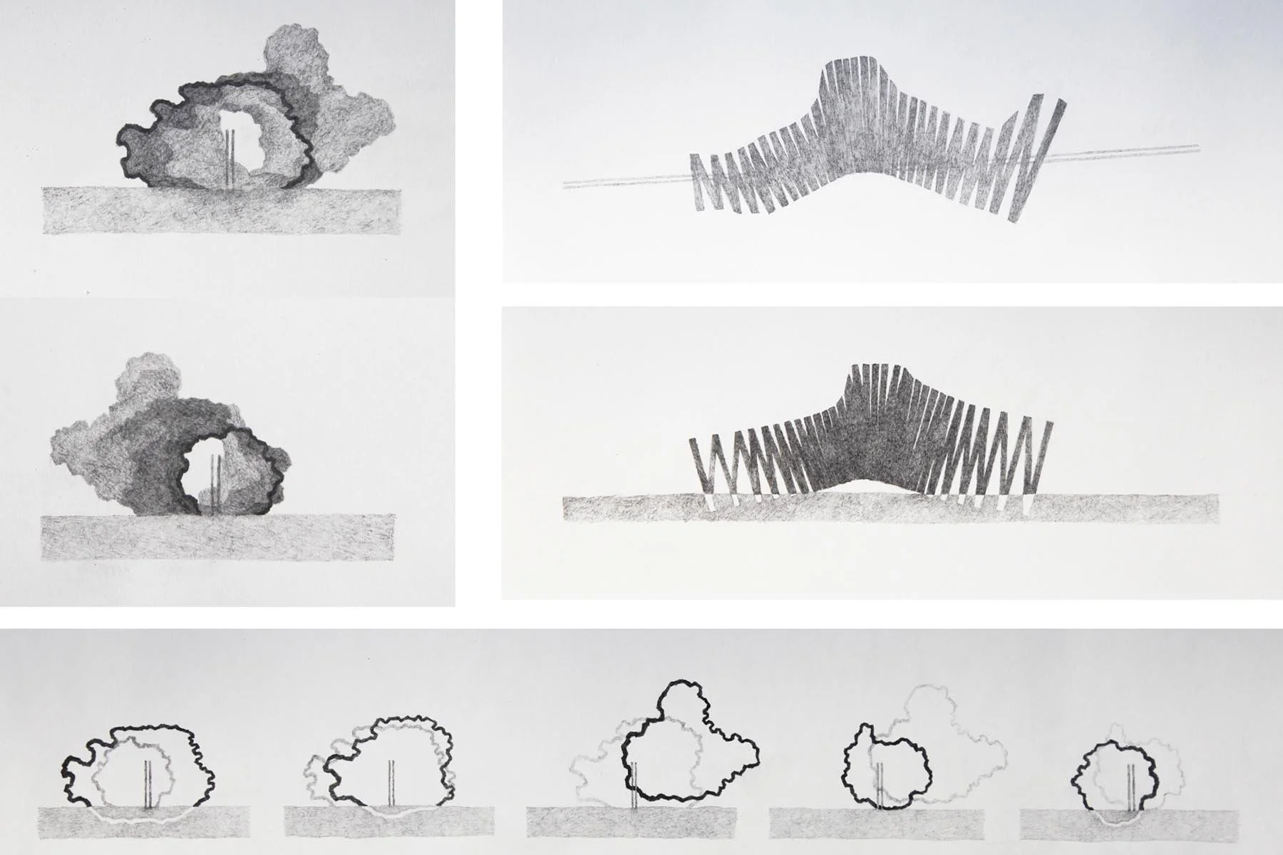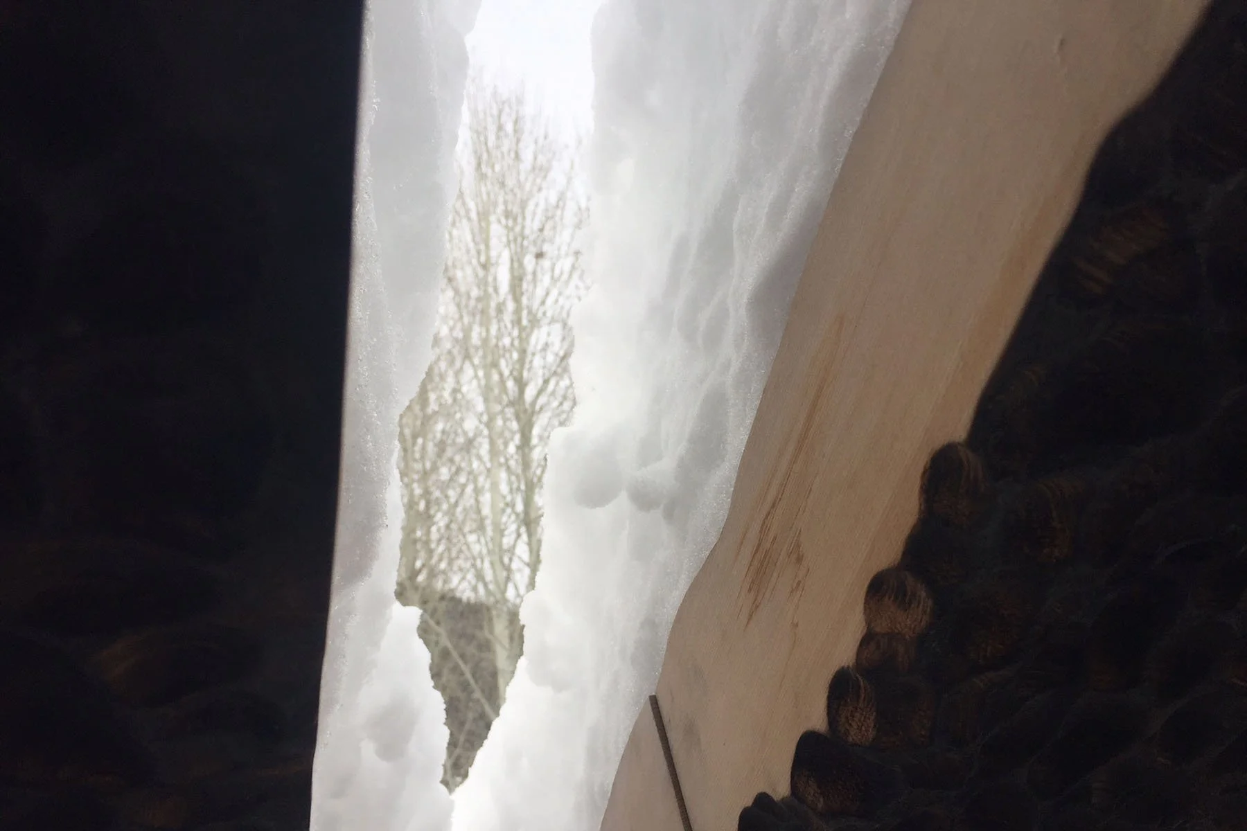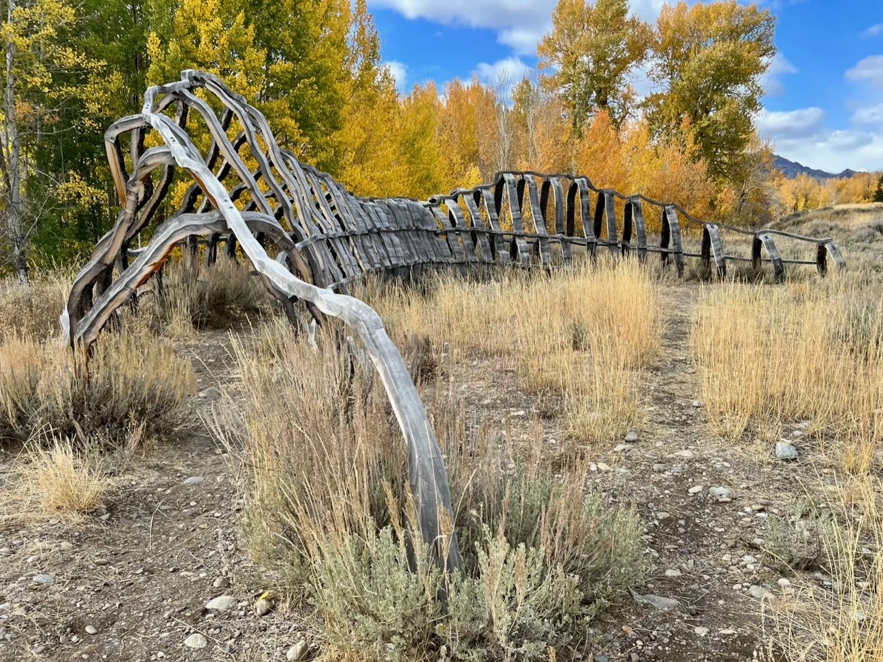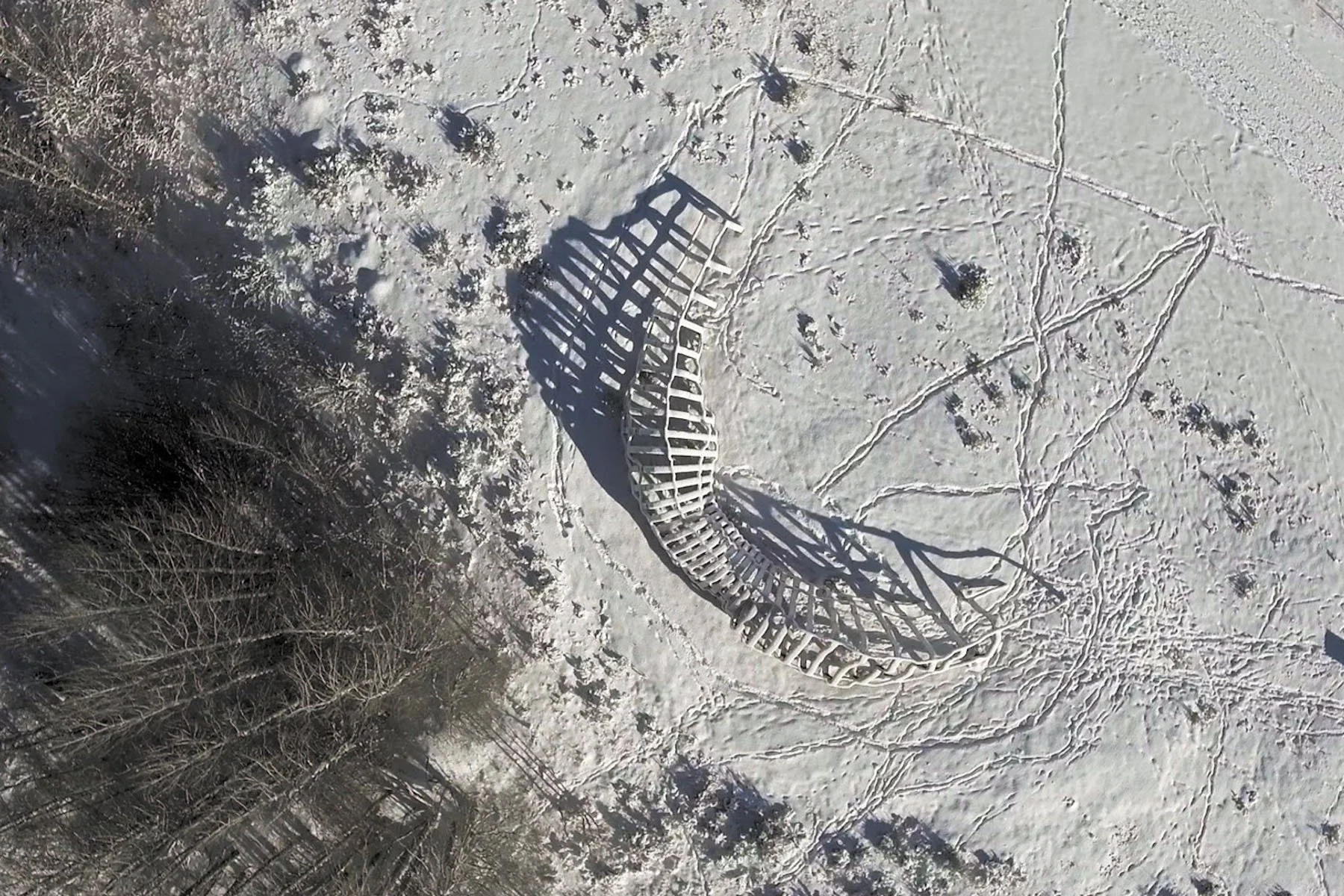 Spur was inspired by lava tube caves under the surface of Craters of the Moon National Monument in Central Idaho, where it was temporarily installed. The sculpture was also inspired by the history of the Intermountain West Railroad, particularly the spur line that once diverged north from the main tracks, abutting the National Monument into the Wood River Valley. Struck by its extraordinary geology, Grade digitally scanned the interior of a lava tube cave as the basis for the sculpture. Large enough for visitors to pass through, the sculpture is constructed of standing dead yellow cedar salvaged from Mitkof Island, Alaska. With its charred black interior surfaces, the journey through Grade’s sculpture alludes to the experience of exploring caves within the park. The sculpture’s vertical members are scaled to the thickness of railroad ties and the paired horizontal spines running the length of the sculpture evoke railroad tracks as well as mirroring the surrounding horizon lines of undulating mountain peaks. In October 2016, the sculpture was relocated and permanently installed in the Wood River Valley in Ketchum, Idaho.